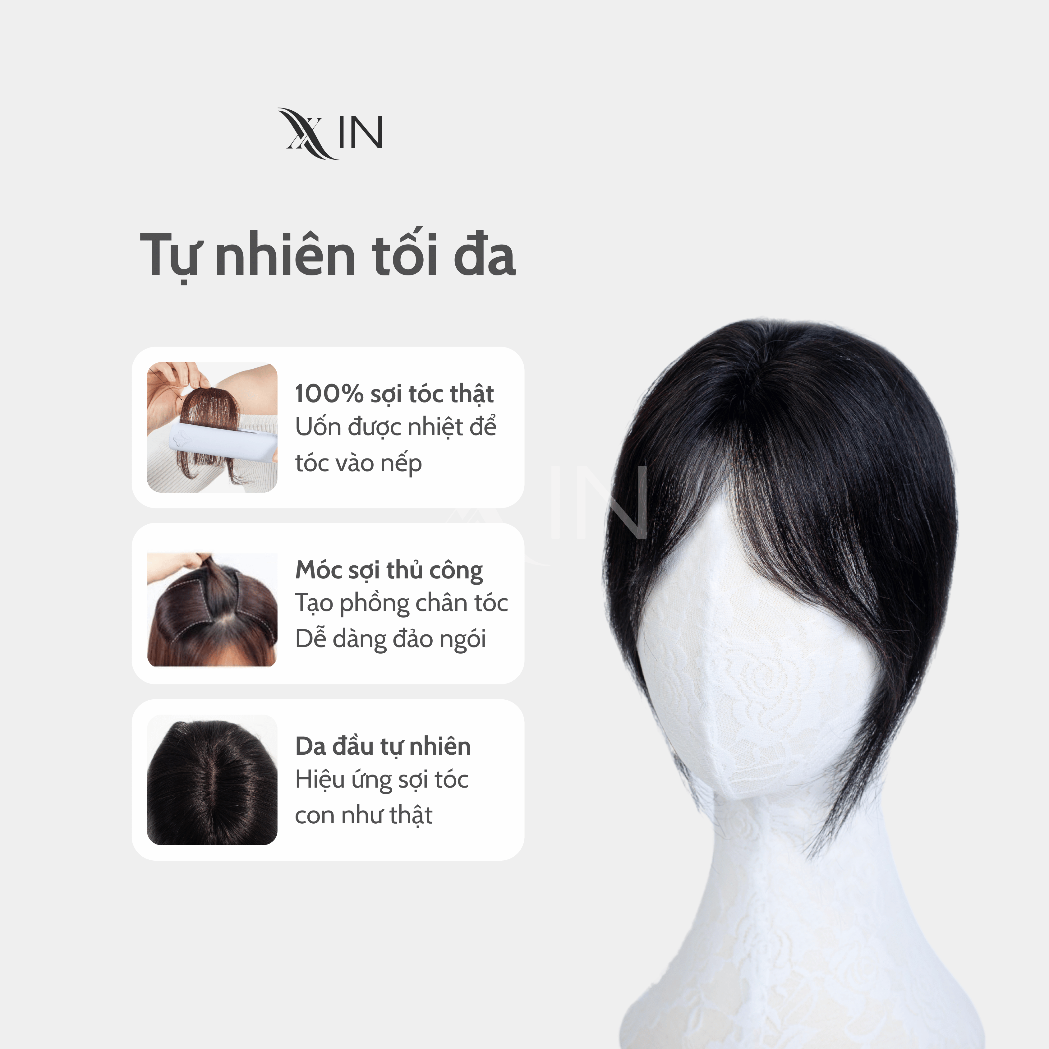 Tóc Thật 100% – Đẹp Hoàn Hảo Không Tưởng: Sản phẩm được làm từ tóc thật cao cấp, đảm bảo sự mềm mại, bồng bềnh và độ rủ y hệt tóc tự nhiên của bạn. Bạn có thể tự tin chạm, vuốt mà không lo bị lộ, mang đến vẻ ngoài hoàn hảo đến từng sợi tóc.